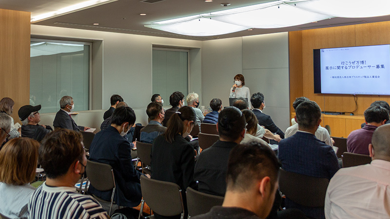 翌2023年1月、協会の会員企業に向けて参加を募集。26社が決定し、うち8社は共同でバイオプラスチック製パイプオルガンを制作し、残る18社は各社が独自開発するバイオプラスチック製品を展示することになった。ここで課題となったのが後者だ。各社がバラバラに開発するうえ、製品や展示イメージについても意見が噴出。「どう一つにまとめたらいいのか……。それに、万博のような展示は初めてだし、このままでは無理だなと」。そこで、メビックへ相談。同年4月17日の「企業によるクリエイター募集プレゼンテーション」に登壇して、展示ディレクターを探していることを訴えた。