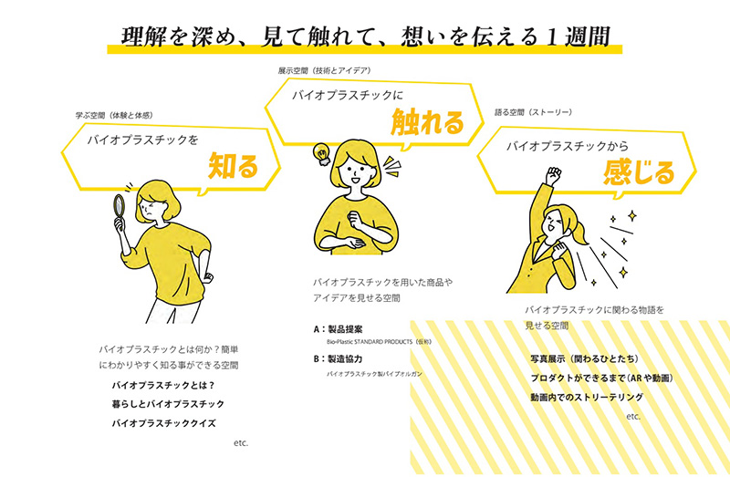 クリエイター募集プレゼンの後、吉永さんと和田さんは別々にプランを提案。吉永さんは、「来場者に良い面も悪い面も見せて、バイオプラスチックについて考えてもらいたい。『知る・触れる・感じる』の3つを柱にして、『考える』につなげるストーリーを考えました」と言い、単純な素材紹介におさまらないプランを提案。和田さんは、「プロダクトデザイナー5名でチームを組み、私がまとめ役に。18社へのヒアリングから始め、プロダクトのトーンを合わせてアウトプットしていく体制を伝えました」と、プロダクト面での全面バックアップを申し出た。