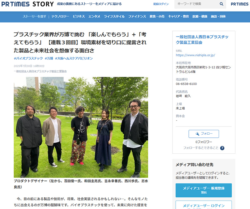 また、集客を左右する広報には、吉永さんがメビックを通じて知り合ったPRリンクへ依頼。同社代表の神崎英徳さんは、「西プラは、メディアに取り上げてもらうための対外広報の経験がない。そこは、私たちの得意分野です」と快諾。さらに、バイオプラスチックと社会課題をつなげて発信する必要性から、担当スタッフとして工業新聞記者の経験を持つ福井弓子さんをアサインした。「環境対応型の素材は、技術だけではなく、『価格は高くても環境に良いから買う』という市場認識も必要。万博は一般の人に伝えられるチャンス! やりがいを感じました」と、福井さんは振り返る。