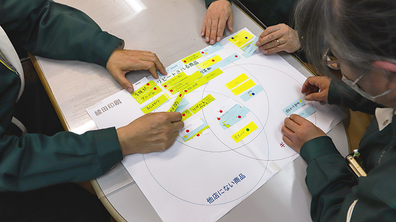 「みんな同じようなことを考えてると思ってたんですけど、違ったんです。それぞれが違う意見を持っていたんだということが見えてきました」と語るのは、プロジェクトの実行役を担当した綾田印刷の柳奈々さん。その他のワークも続けながら、強みや現状の整理を進めていった。