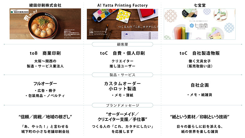 一つめが「綾田印刷」。これは従来の生業であるBtoBの商業印刷。「何でもやります」という小回りが効いて、器用な印刷事業の主軸。