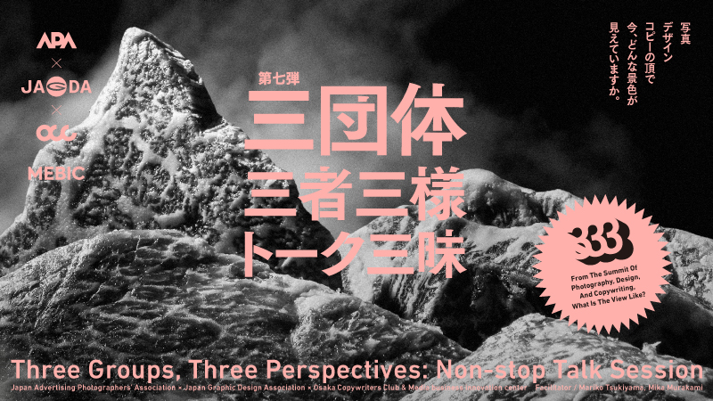 関西クリエイティブ業界の三団体、「日本広告写真家協会(APA)」「日本グラフィックデザイン協会(JAGDA)大阪」「大阪コピーライターズ・クラブ(OCC)」によるコラボイベントの第七弾を開催します。今回は、ファシリテーターにプリンティングディレクターの築山万里子さん、コピーライターの村上美香さんをお迎えし、三者三様のトークを繰り広げます。