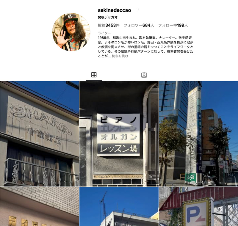 1989年、和歌山市生まれ。取材執筆業。ナレーター。散歩愛好家。よそのロン毛が怖いロン毛。野田・西九条界隈を拠点に散歩と飲酒を両立させ、街の重箱の隅をつつくことをライフワークとしている。その風貌や行動パターンに反して、職務質問を受けたことがないのが自慢。取材や執筆、編集においても、実は手堅い手腕を発揮する。クライアントワークのほかに自費出版『考えた』シリーズを上梓。