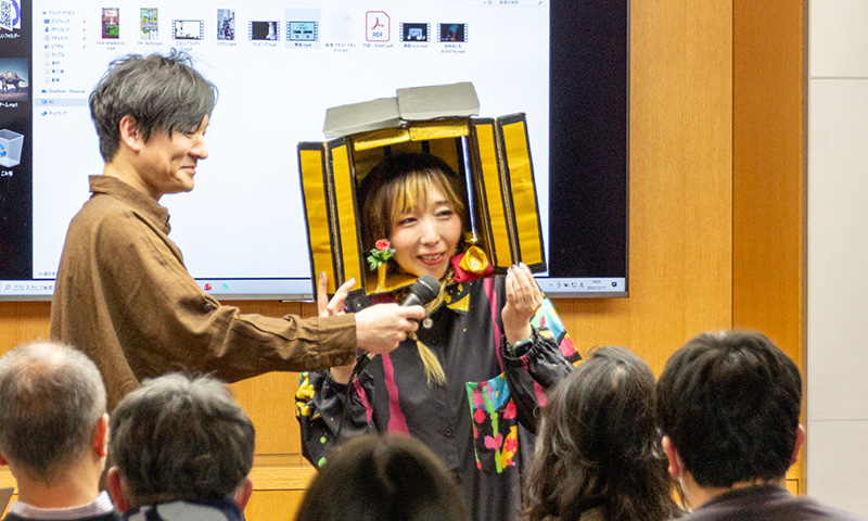 北川さんのセリフが会場の笑いを誘う。そしてようやくオルコエトーさんが登場するも、頭には手作りの仏壇の模型が。そして、仏壇の扉を開けてもらってひと言「これは、かぶるだけでお参りされる側の気持ちになれる『だれでもおぶつだんセット』です」。